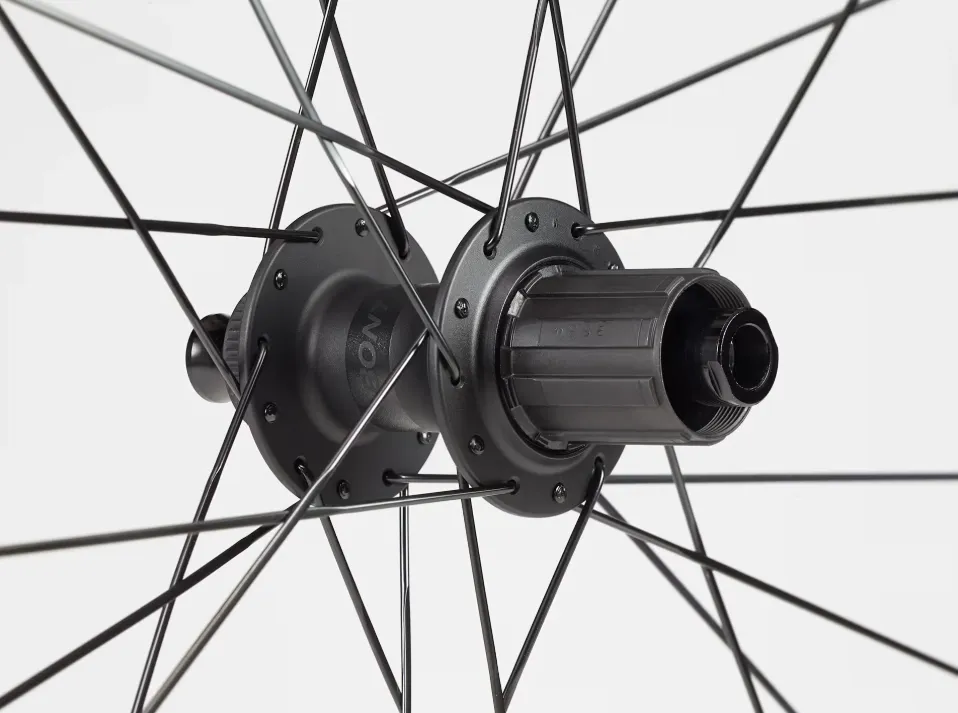 3. Náboje pre kotúčovú brzdu s uchytením Center Lock, 12mm pevná predná a zadná os, cestný náboj Bontrager Rapid Drive 108.